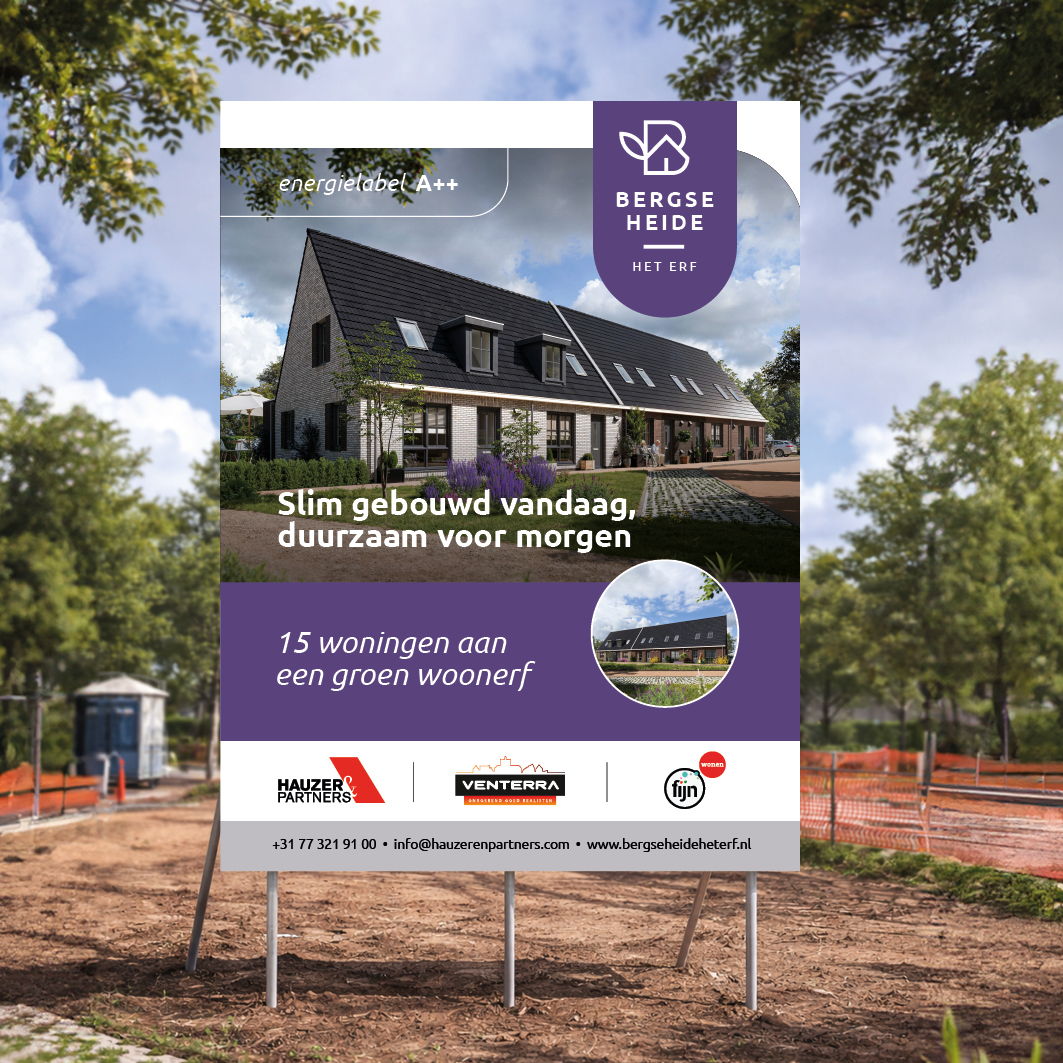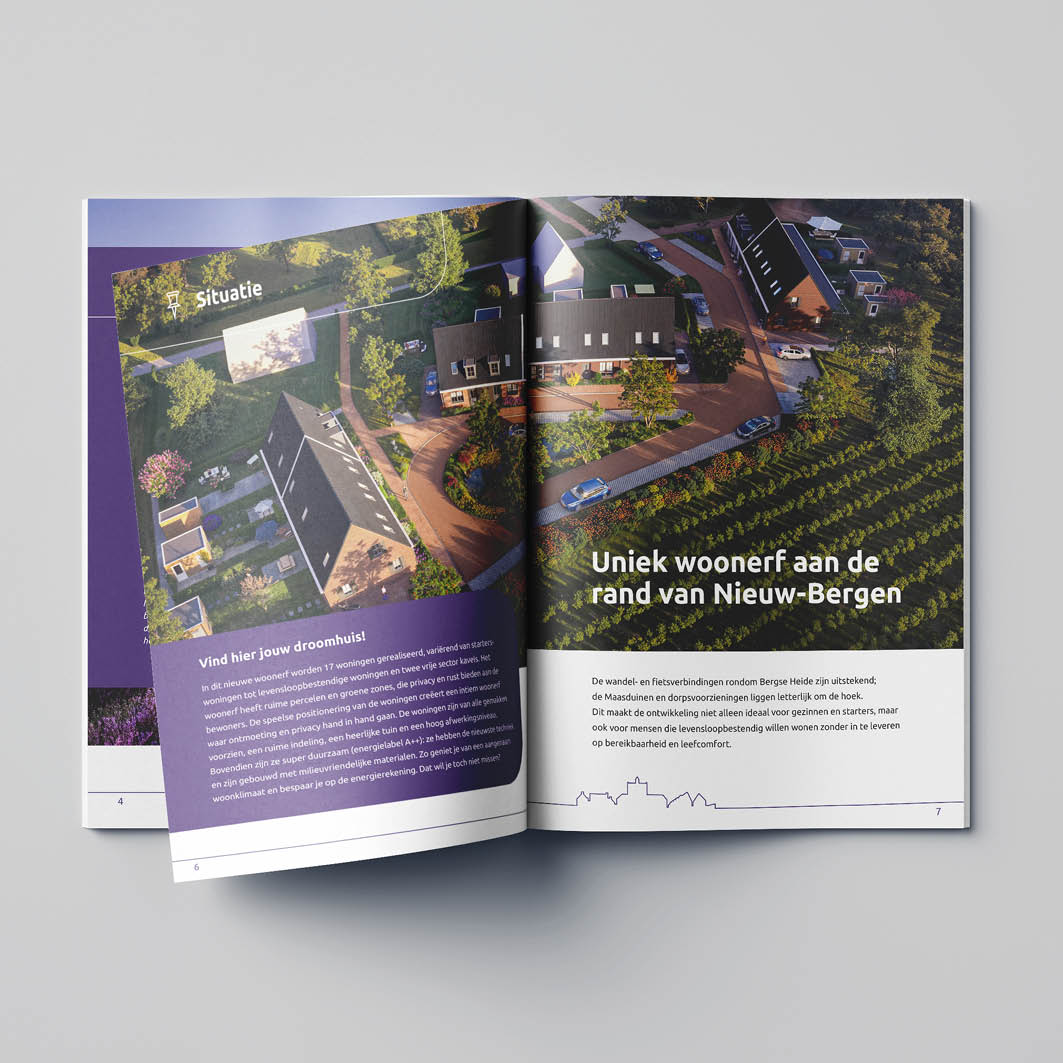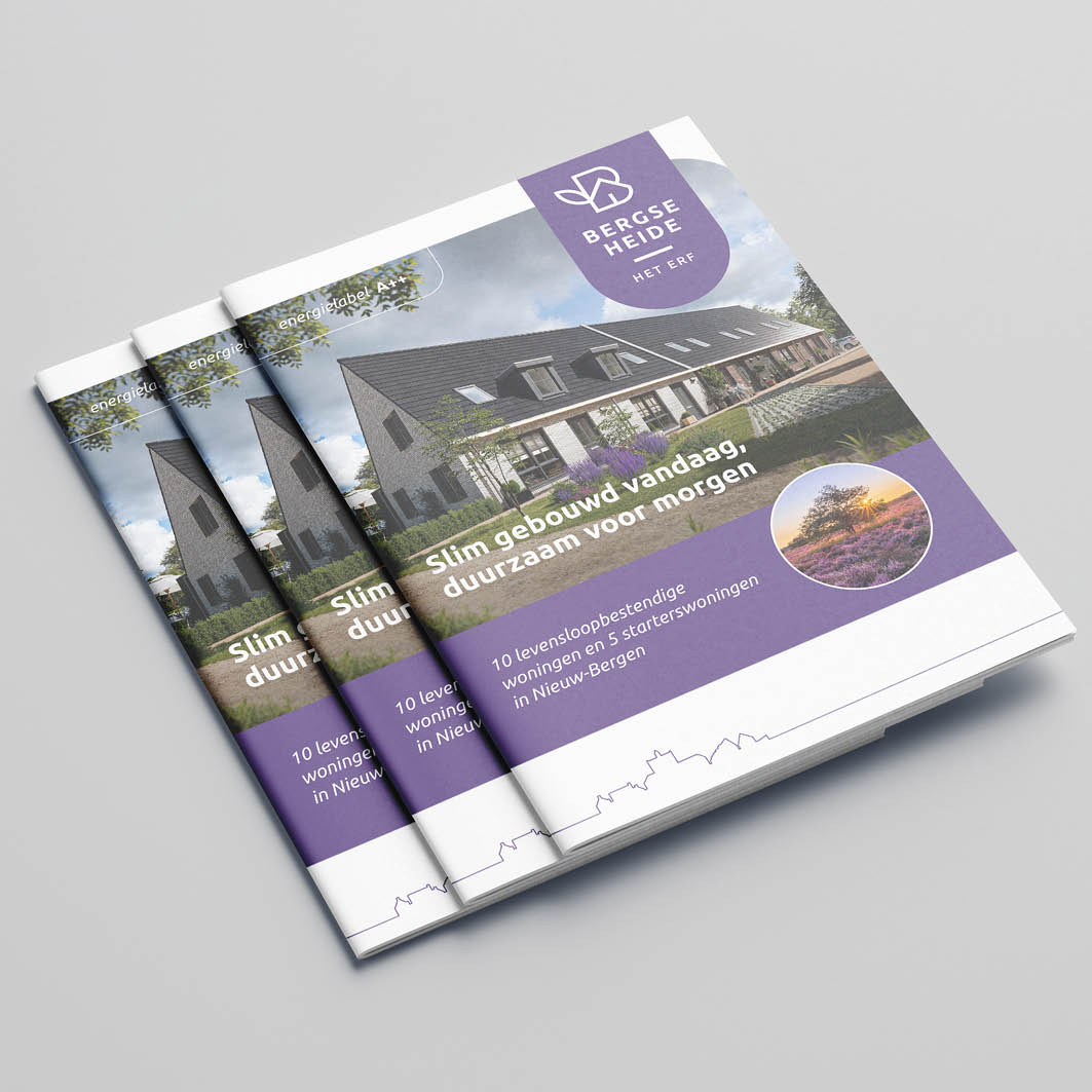 Voor het nieuwbouwproject Bergse Heide – het erf in Nieuw-Bergen heb ik de huisstijl, het logo en de verkoopbrochure mogen ontwerpen. Het project bestaat uit een sfeervol woonerf met 17 woningen, omringd door groen en ruimte. In de huisstijl heb ik geprobeerd deze rustige en natuurlijke omgeving terug te laten komen, onder andere door de paarse kleur van de heide als belangrijk element te gebruiken.
